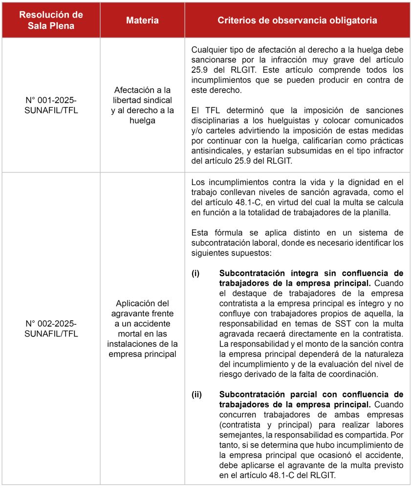 Nuevos precedentes de observancia obligatoria del Tribunal de Fiscalización Laboral (“TFL”).- Se han establecido los siguientes criterios de observancia obligatoria: