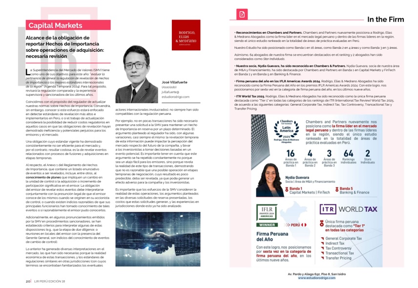 ARTÍCULO. José Villafuerte, nuestro asociado especialista en Mercado de Capitales, aborda la reciente intención de la Superintendencia del Mercado de Valores - #SMV, de revisar la regulación sobre Hechos de Importancia en operaciones de adquisición. Esta revisión busca alinear las normativas peruanas con estándares internacionales. También, discute la necesidad de actualizar las normas señalando que la revelación temprana puede generar costos innecesarios y afectar la percepción del mercado.