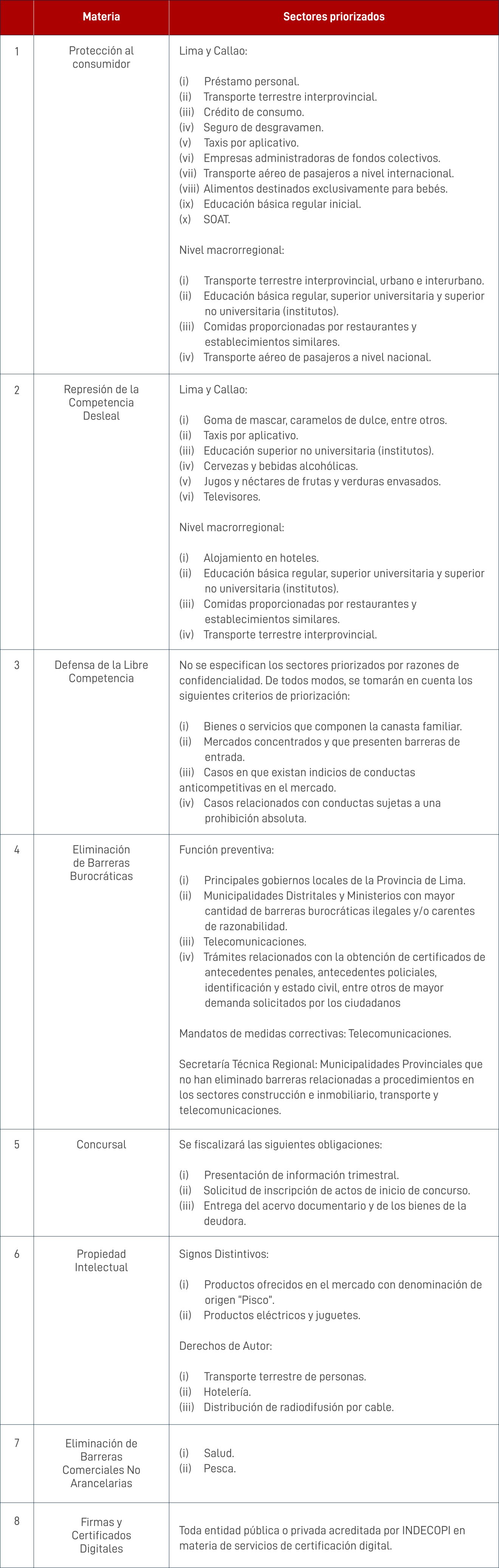 De conformidad con el PAF, los sectores priorizados para la ejecución de actividades de fiscalización del INDECOPI en el 2025, respecto a cada materia, son los siguientes: