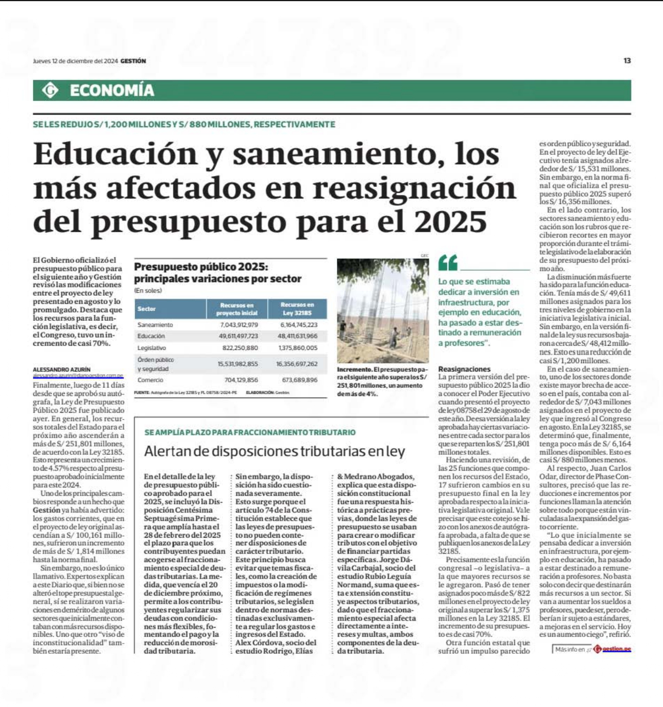 Alex Córdova, nuestro socio especialista en derecho tributario, brindó comentarios para la sección de Economía del diario Gestión, en el artículo titulado 'Educación y saneamiento, los más afectados en la resignación del presupuesto para el 2025."