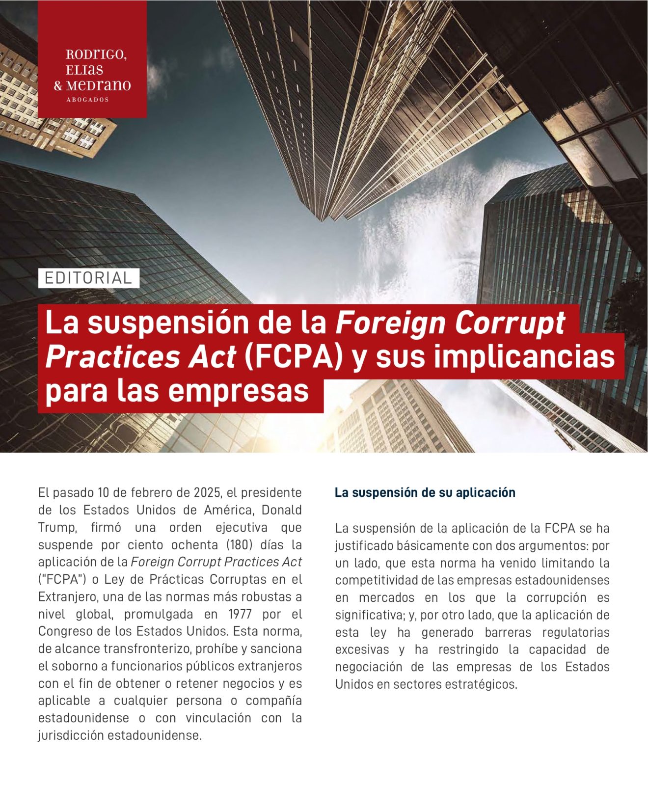 El 10 de febrero de 2025, el presidente de los Estados Unidos de América, Donald Trump, firmó una orden ejecutiva que suspende por ciento ochenta (180) días la aplicación de la Foreign Corrupt Practices Act (“FCPA”) o Ley de Prácticas Corruptas en el Extranjero, una de las normas más robustas a nivel global, promulgada en 1977 por el Congreso de los Estados Unidos. Esta norma, de alcance transfronterizo, prohíbe y sanciona el soborno a funcionarios públicos extranjeros con el fin de obtener o retener negocios y es aplicable a cualquier persona o compañía estadounidense o con vinculación con la jurisdicción estadounidense.