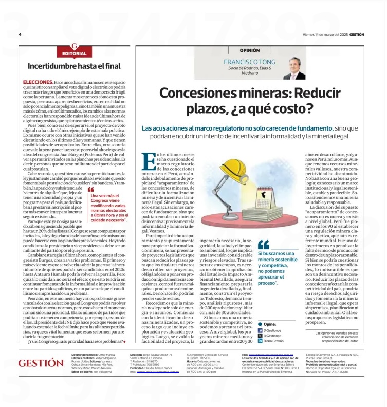 Nuestro socio especialista en derecho minero, Francisco Tong, compartió su opinión en una entrevista con el Diario Gestión sobre los proyectos legislativos que buscan reducir los plazos para el desarrollo de concesiones mineras en el Perú. Según Francisco, estas iniciativas, aunque presentadas para frenar el "acaparamiento" de concesiones y promover la formalización minera, podrían tener efectos negativos al incentivar la informalidad y la minería ilegal.